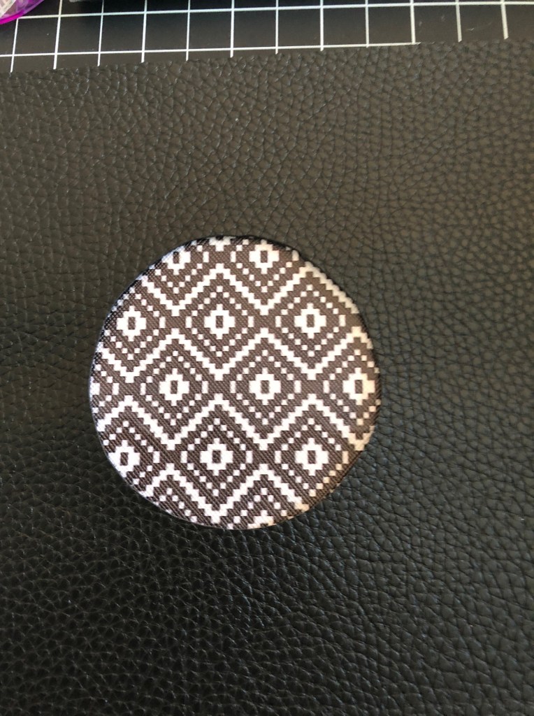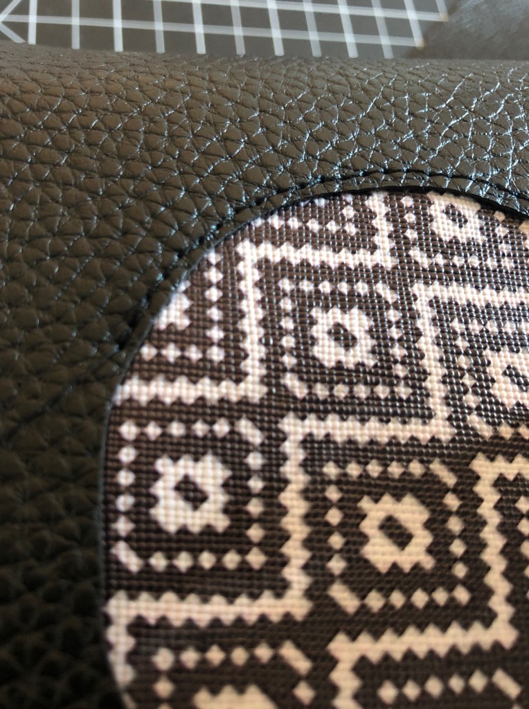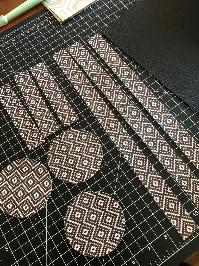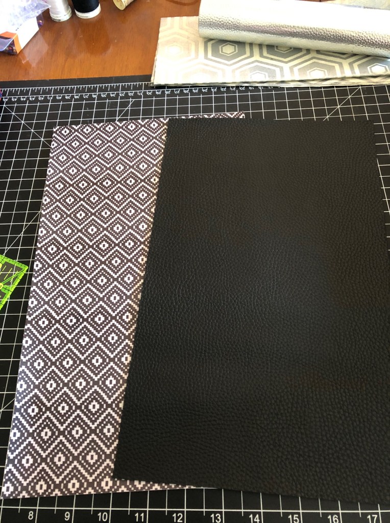 I picked up some pleather (the patterned stuff) which came in a super weird dimension- 13.25(ish) in. x 7.75(ish) in. The black I cut from a larger piece to measure a full 8 x 12 inches. Why? Because I’m tedious like that.