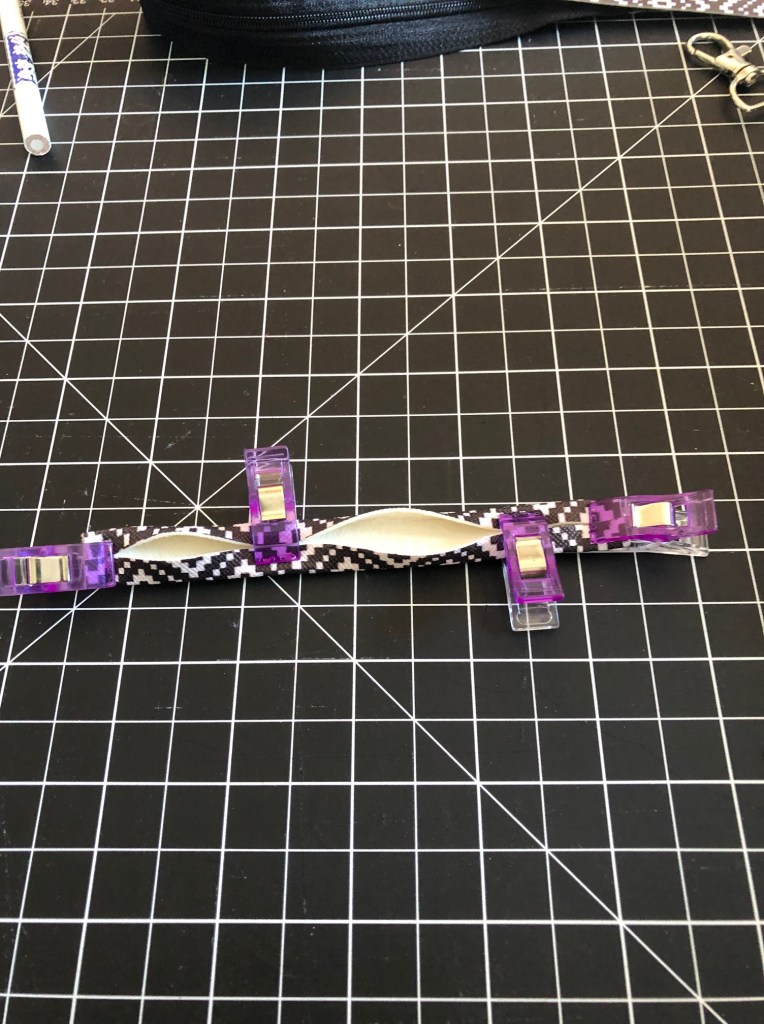 Take the shorter 1″ strip, and fold the outside edges towards the center. Clip them. Use as many as you need to. Love the clip. Embrace the clip.
