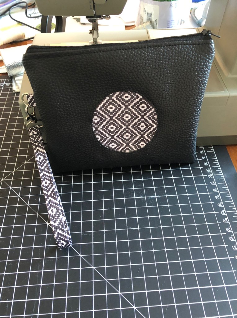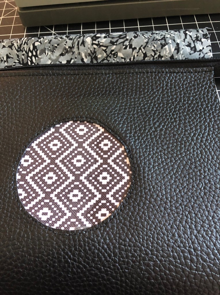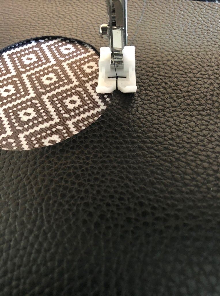 The d-ring only needs a short little tab on the outside of the bag, so you can adjust it along the edge of the pleather exterior part of the bag, about 1.5″ down from the zipper. The ring should be tucked in so it will show when the bag is right side out (see photo below).