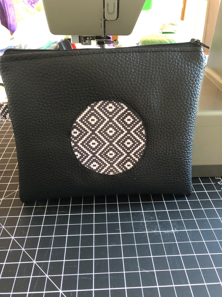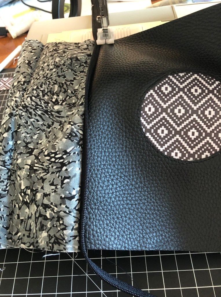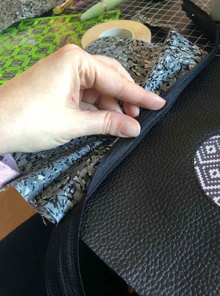 Reach inside and pull the zipper all the way open. I don’t have a picture of this because I didn’t think of it at the time the inside of the bag is dark and I didn’t really think it needed a photo. Use the opening in the liner to flip your bag right side out. You may need to work the pleather part a little bit, though try not to crease it when you turn it.