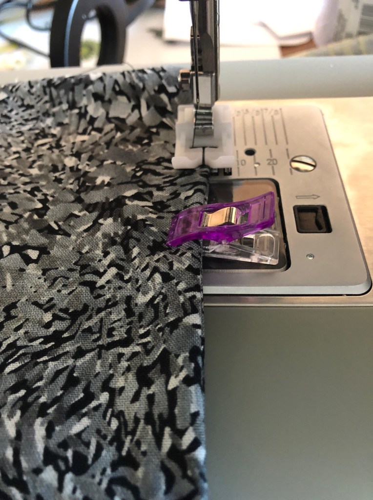 Above you see two clips at the end of the liner. That’s where we’re going to leave an opening so we can turn the bag right-side out. Sew with an approximately 1/4in seam allowance up each side from either side of the opening in the lining.