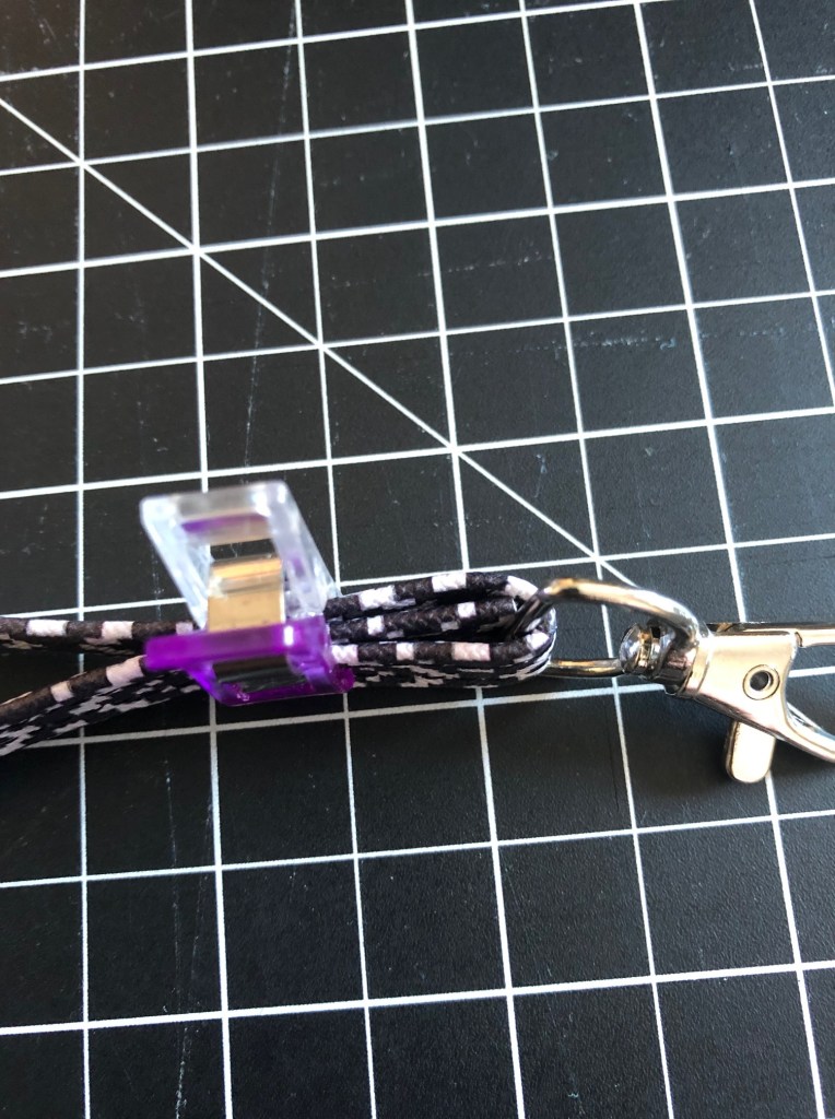 Fold the other end down to where the d-ring rests, and fold the tab you fed through the loop over the end you brought down. Clip it so it doesn’t go flying off.