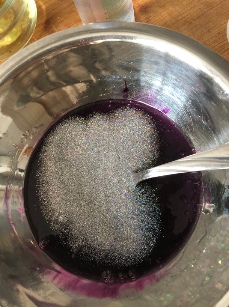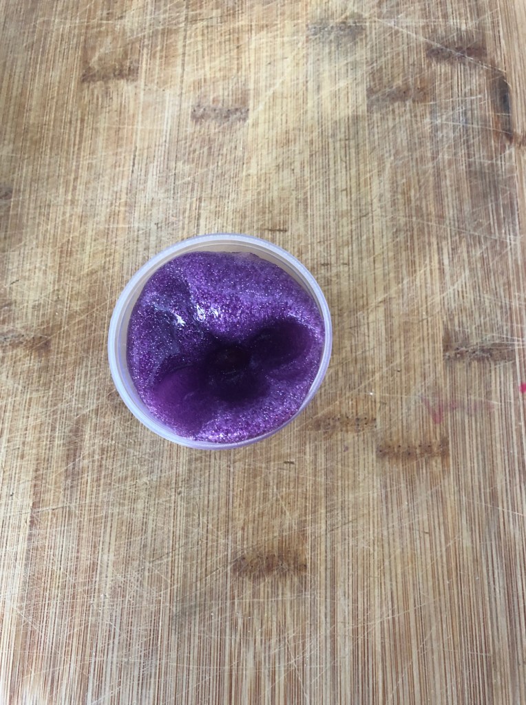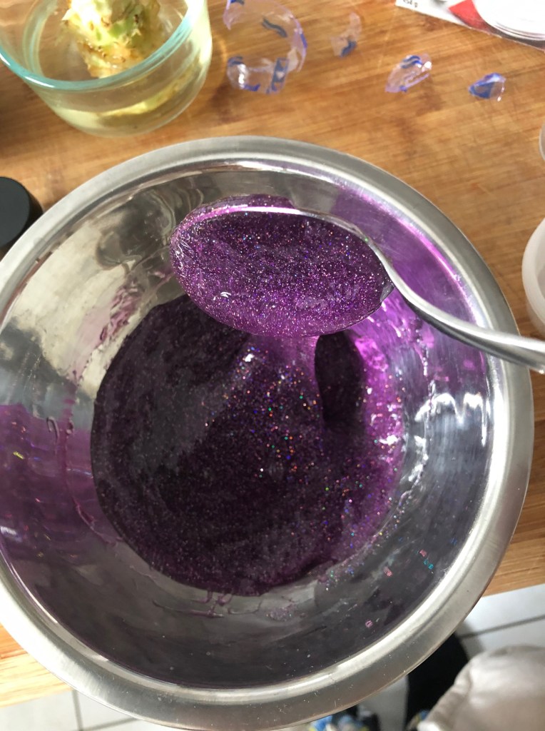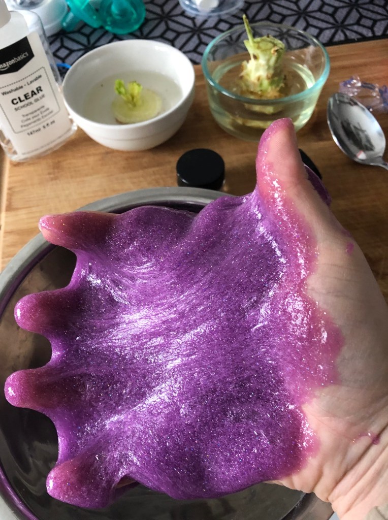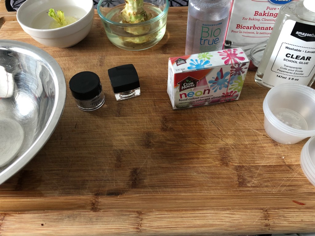 I actually bit the bullet and made slime for a couple of reasons- firstly, I had some expired contact lens solution which conveniently contained both boric acid and sodium borate, and I couldn’t bring myself to just throw away an unopened bottle.