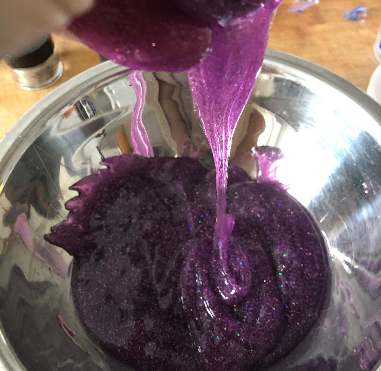 This is the part where it goes from ‘I’ve just made coloured glitter glue’ to ‘I’ve activated the mixture and actually made slime’. Toss in the 1 1/2 tbsp of contact lens solution.